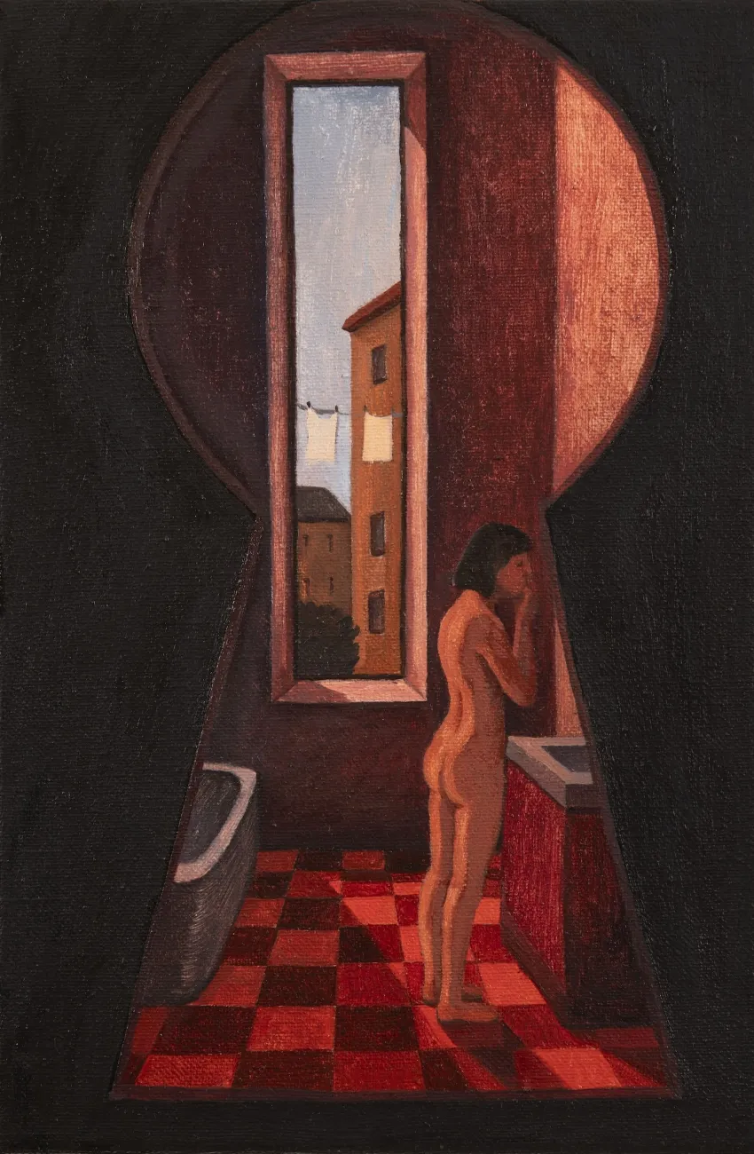 🔎 O co jde: Postavy na autorčiných obrazech se věnují všedním činnostem, se kterými se lze ztotožnit, často je sledujeme okem zvědavého pozorovatele skrz nějaký průzor, okno či zmíněnou klíčovou dírku.