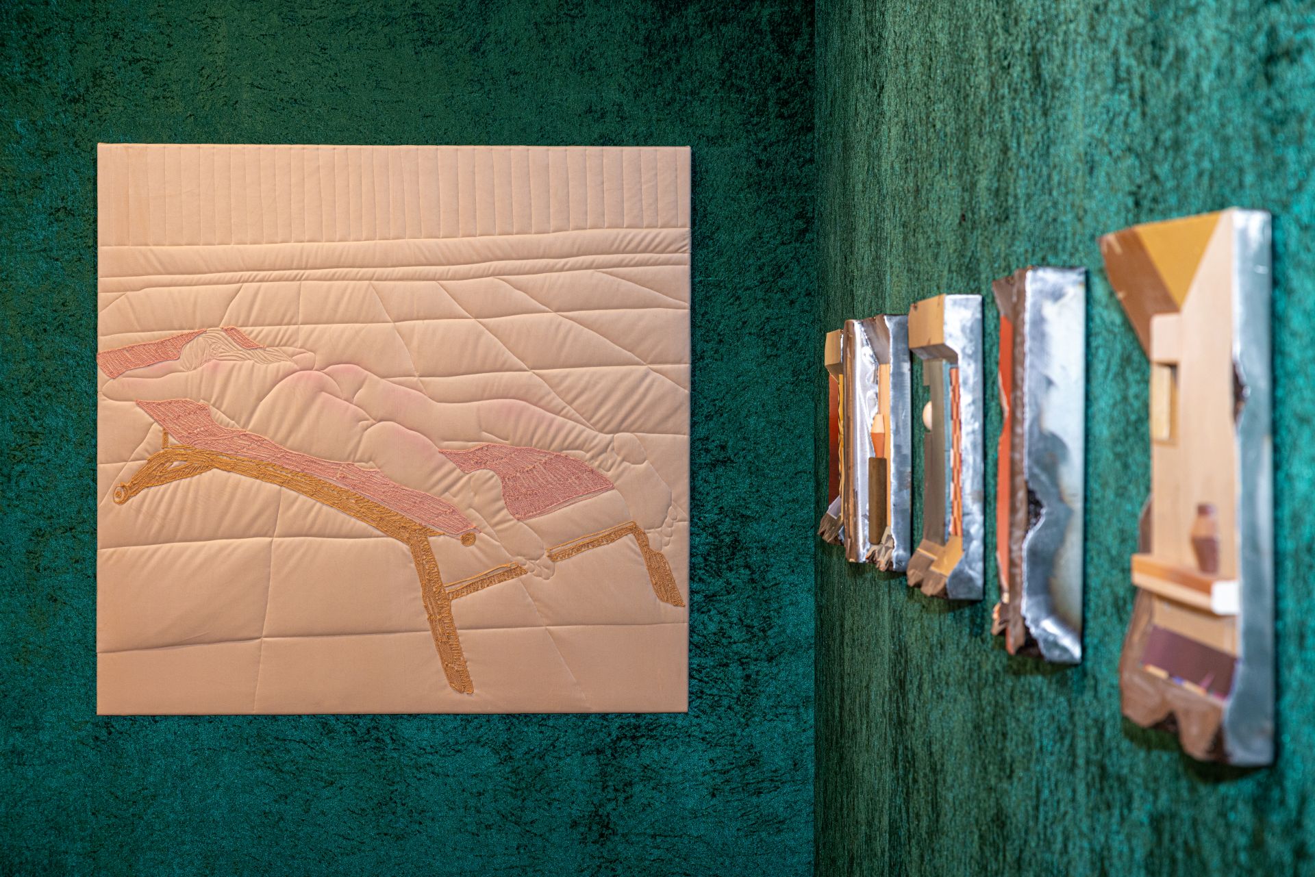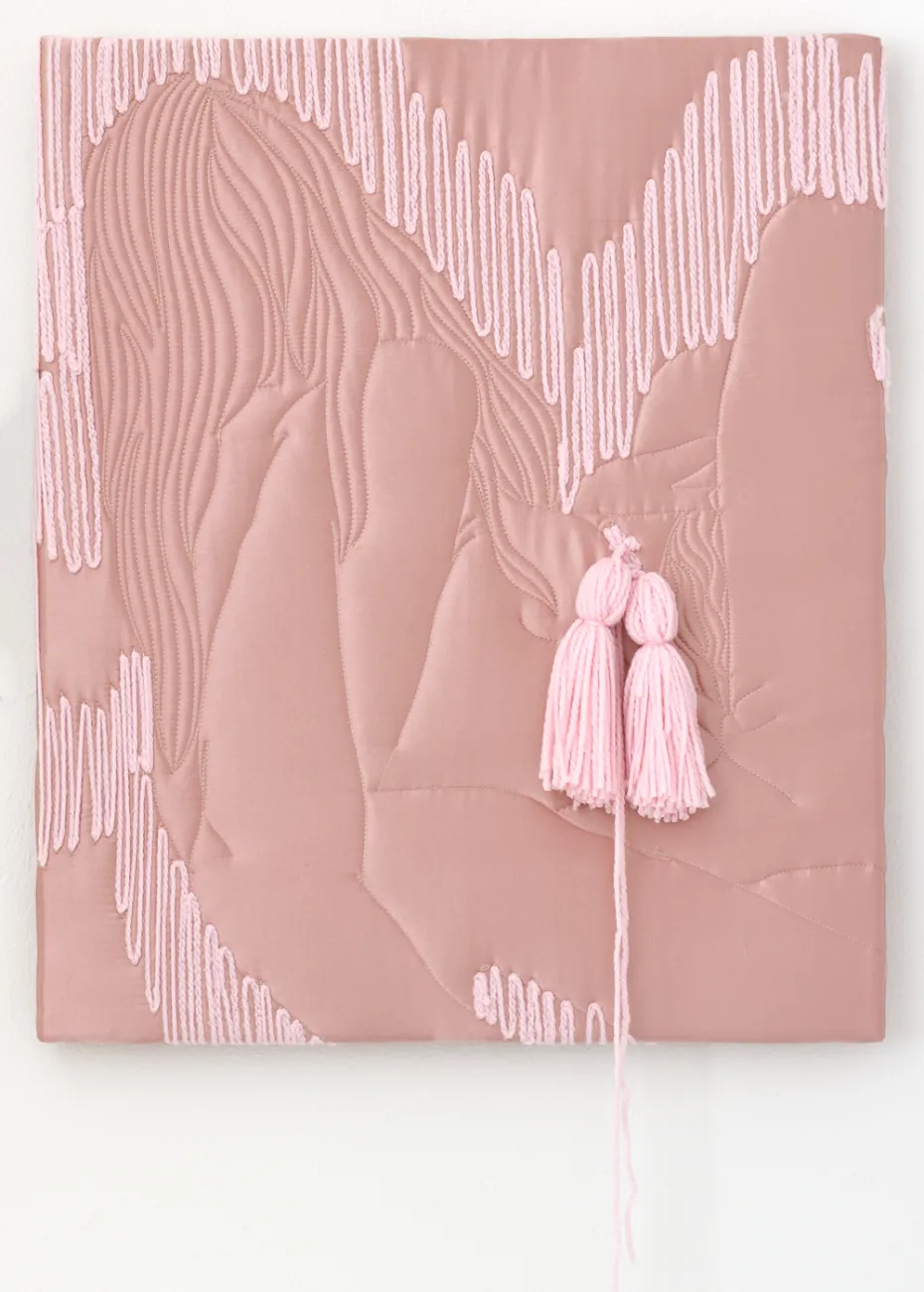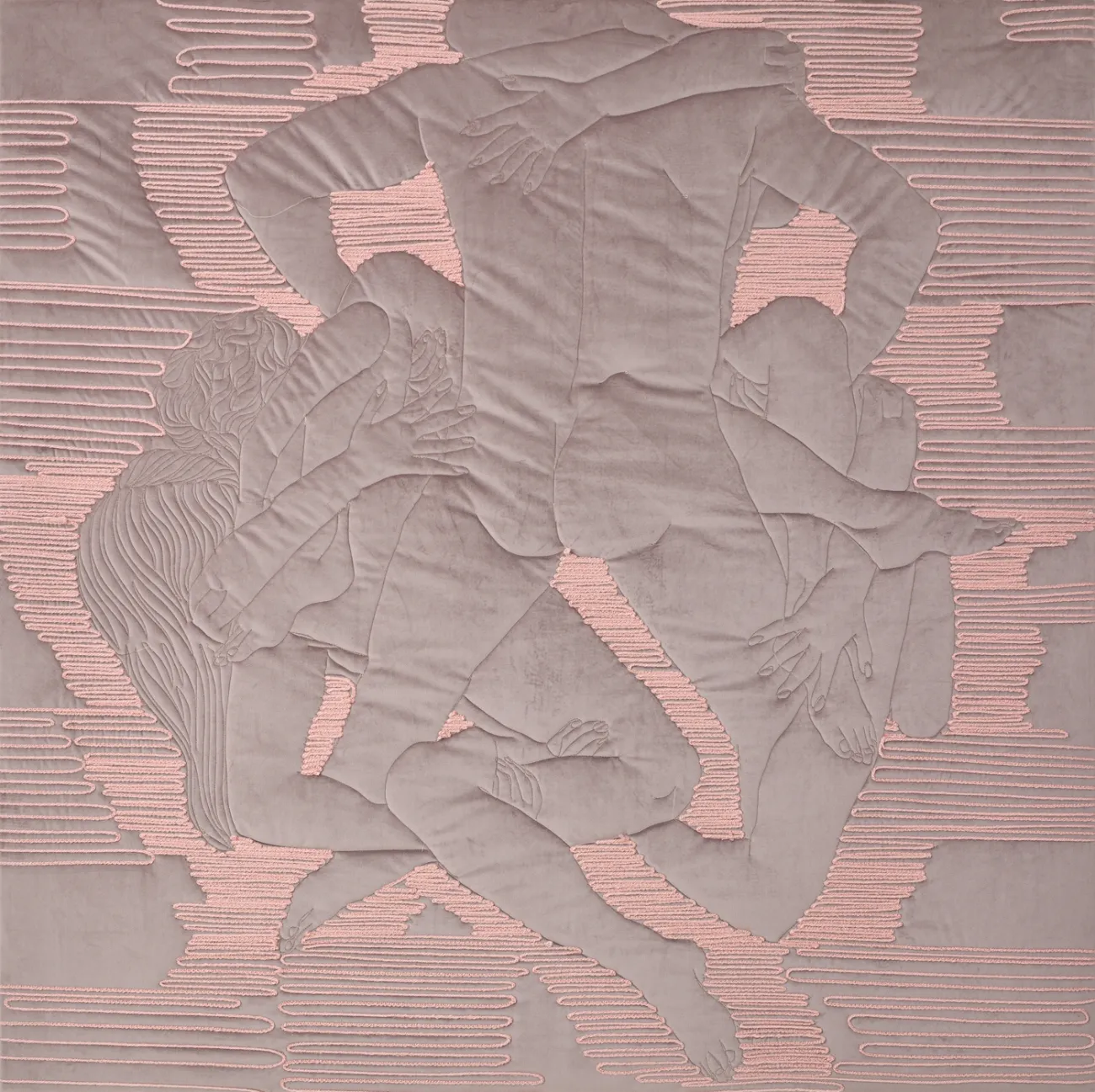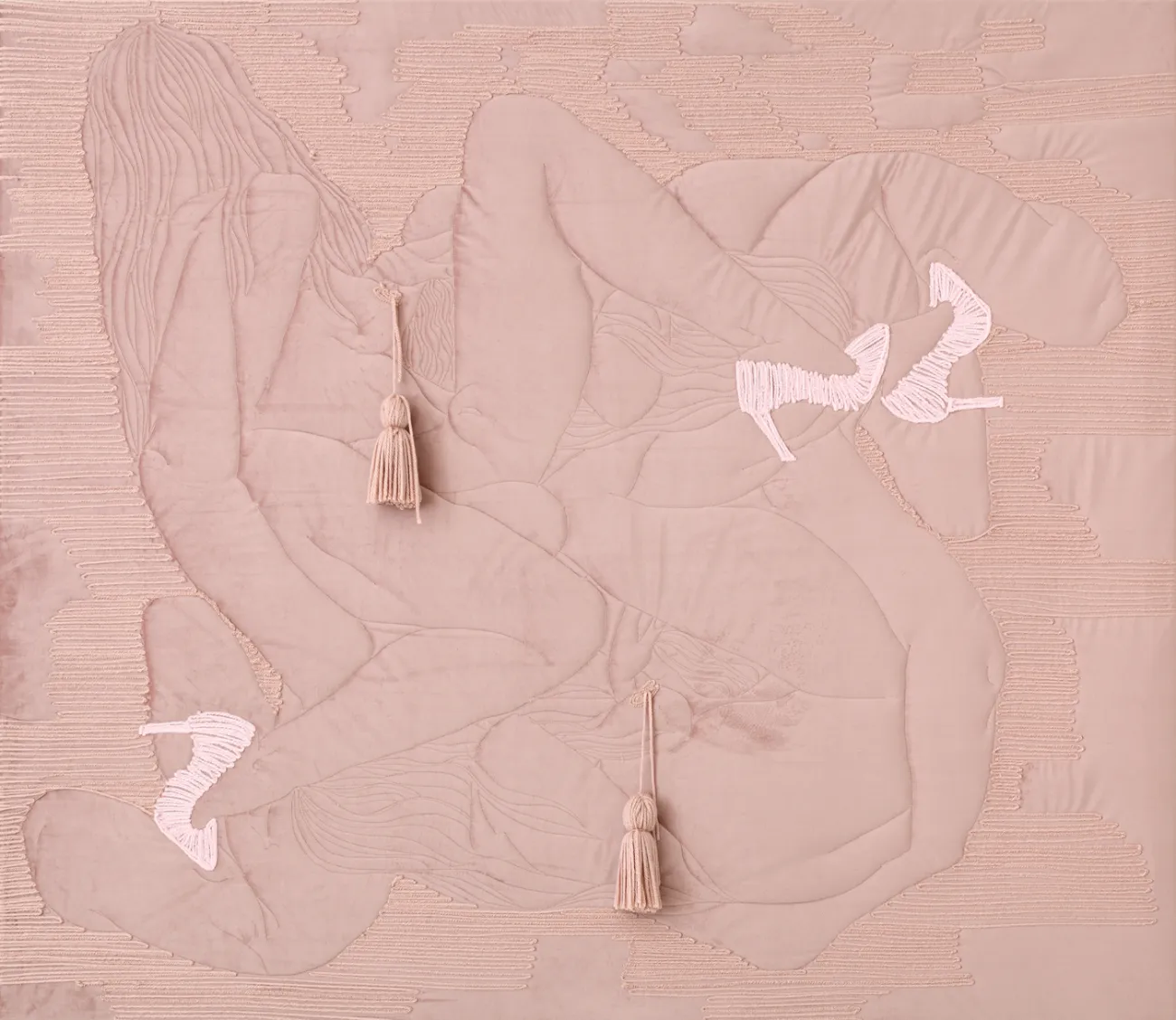 Lucie Rosická za pomoci kresby nití a zpracování textilií – prošívaného sametu či saténu a vypointovaných detailů z perel, nalepovacích nehtů či ozdobných střapců – zobrazuje ženská těla v rozličných intimních situacích.