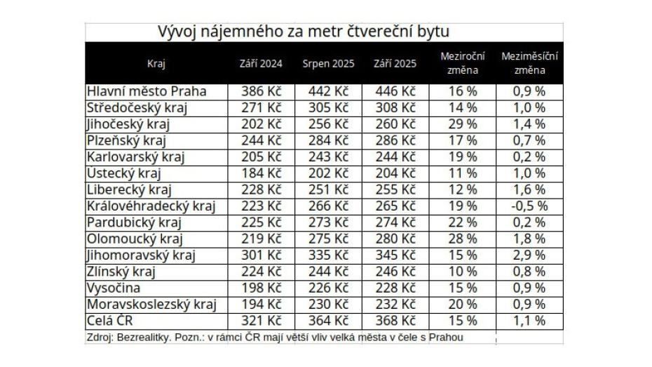 Platí tak, že ve všech krajích nájmy poskočily minimálně o desetinu. Meziměsíční změna je zpravidla kolem jednoho procenta. Nejvíce v Jihomoravském kraji (o tři procenta), naopak o půl procenta nájmy oproti srpnu klesly v Královéhradeckém kraji. Důvod k úlevě to ale není, protože meziročně jsou vyšší o 19 procent.