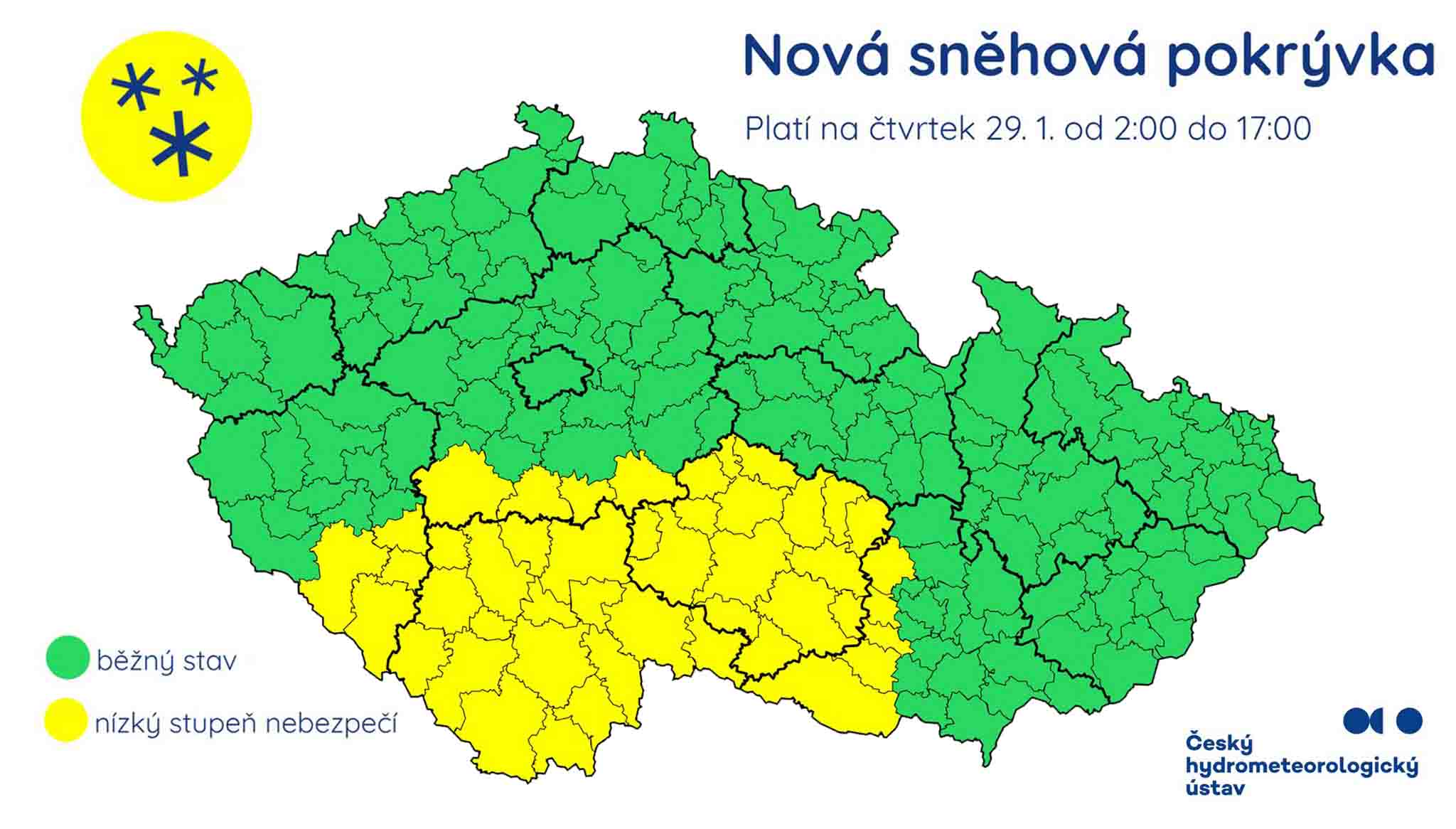 Český hydrometeorologický ústav (ČHMÚ) proto vydal výstrahu před sněhem, která platí zejména pro Jihočeský kraj, jižní polovinu Vysočiny a západ Jihomoravského kraje. Výstraha platí od noci na čtvrtek až do čtvrtečního večera.