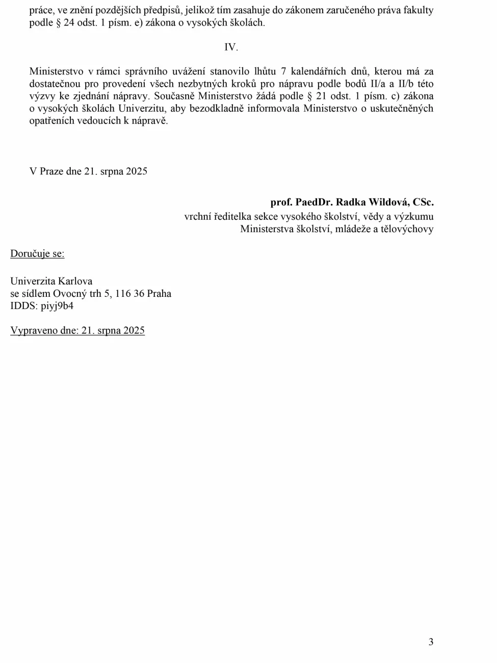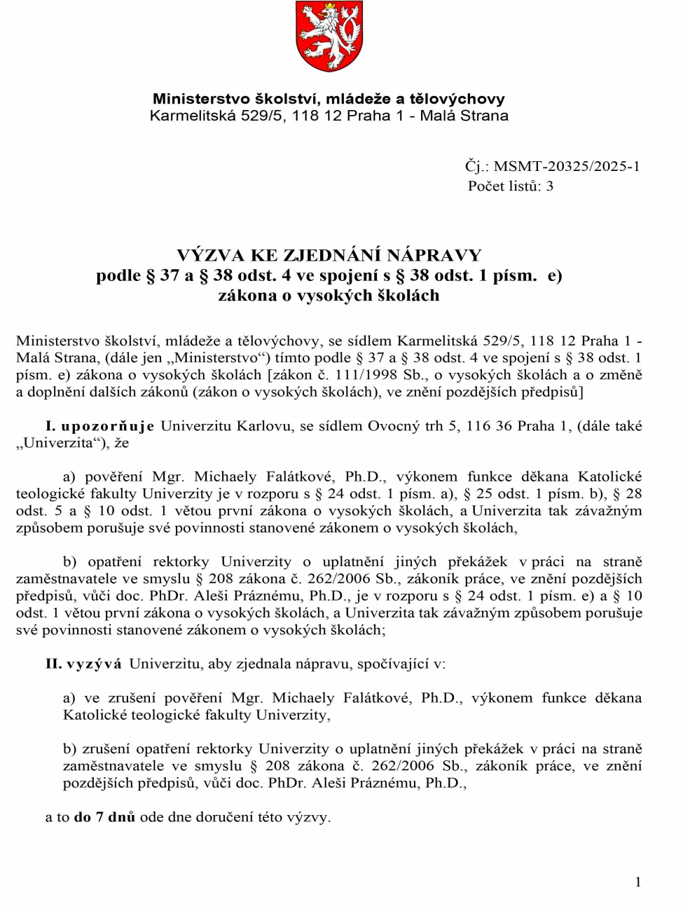 ➡️ Co se stalo: Redakci Publico se podařilo získat neveřejný dopis ministerstva školství, ve kterém ve čtvrtek vyzvalo vedení Univerzity Karlovy, aby učinilo nápravu ohledně dočasného vedení katolické fakulty. Podle ministerstva jednala rektorka Milena Králíčková v rozporu se zákonem, když pověřila vedením fakulty šéfku vedoucí odborů fakulty a statutárního zástupce poslala na takzvané pracovní překážky.