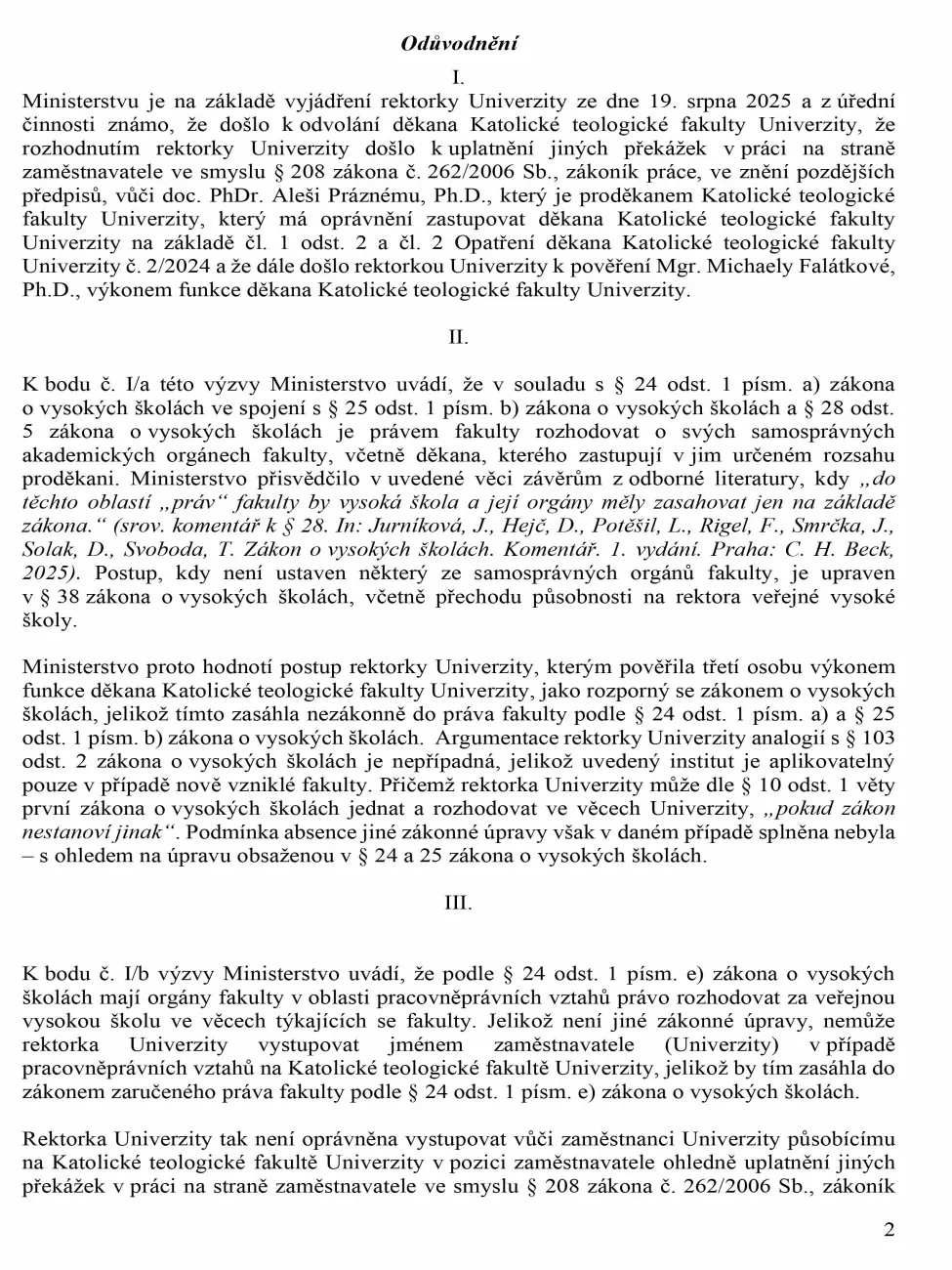 „Ministerstvo proto hodnotí postup rektorky univerzity, kterým pověřila třetí osobu výkonem funkce děkana Katolické teologické fakulty Univerzity, jako rozporný se zákonem o vysokých školách, jelikož tímto zasáhla nezákonně do práva fakulty,“ stojí v dopise vrchní ředitelky sekce vysokého školství resortu, do kterého měla redakce možnost nahlédnout.