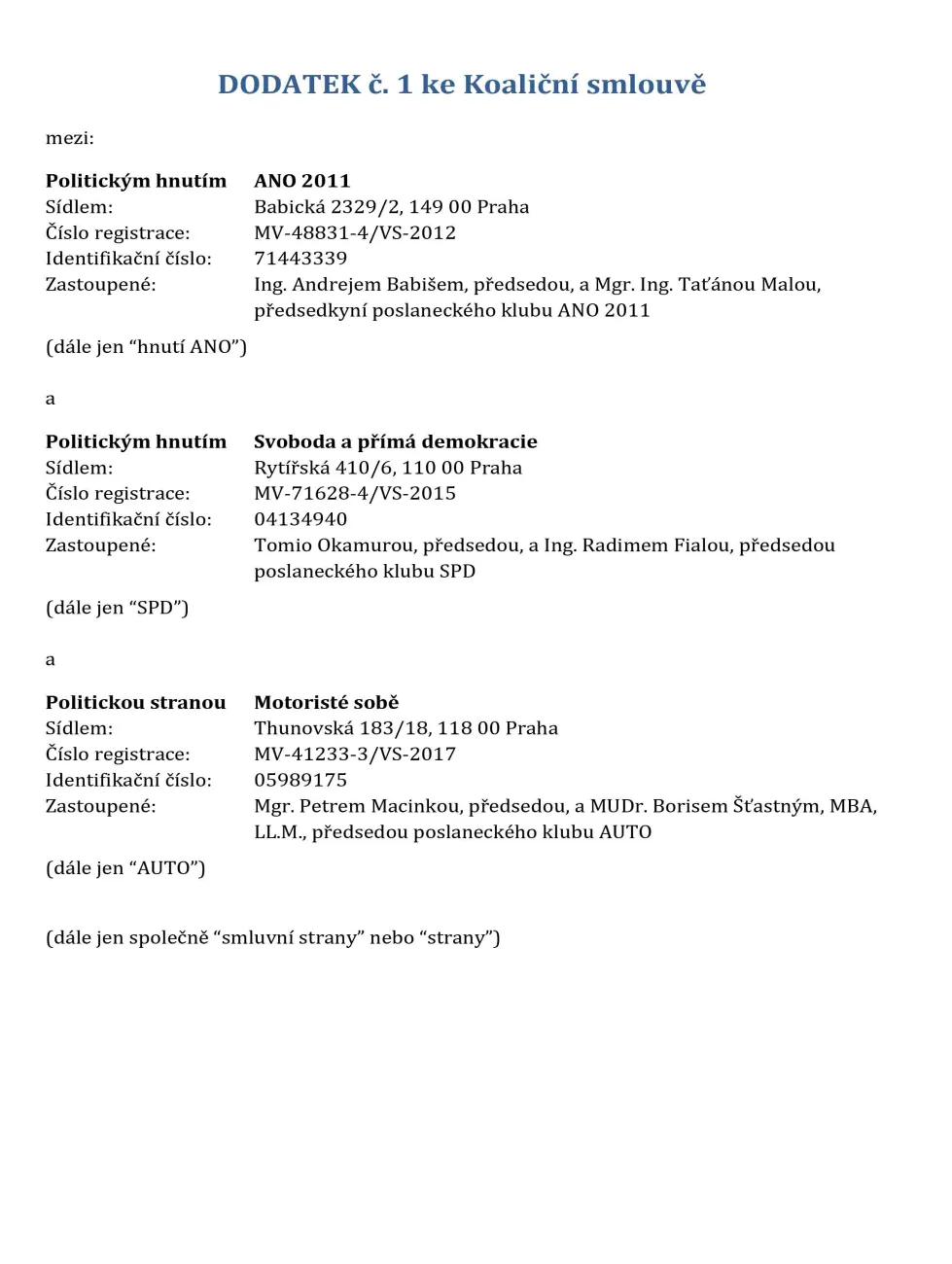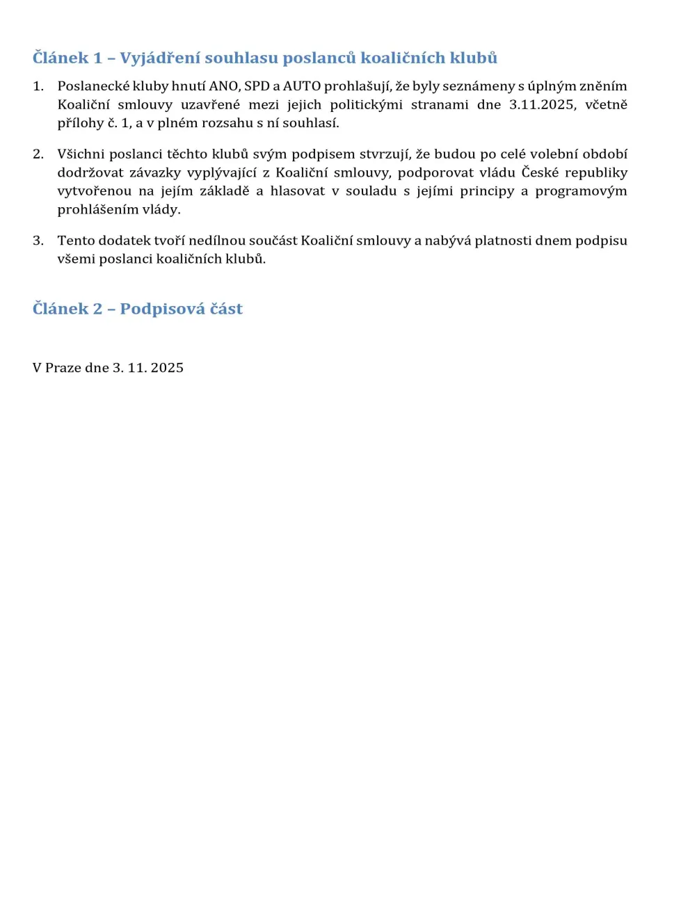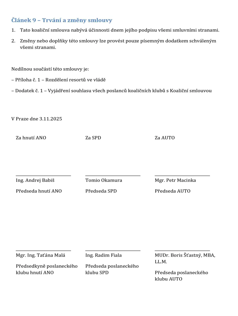 Zástupci vznikající vlády ANO, SPD a Motoristů v pondělí podepsali koaliční smlouvu. Zavazují se v ní, že jejich poslanci budou hlasovat vždy shodně. A „strany zajistí“, že nikdo nebude hlasovat pro pád vlády.