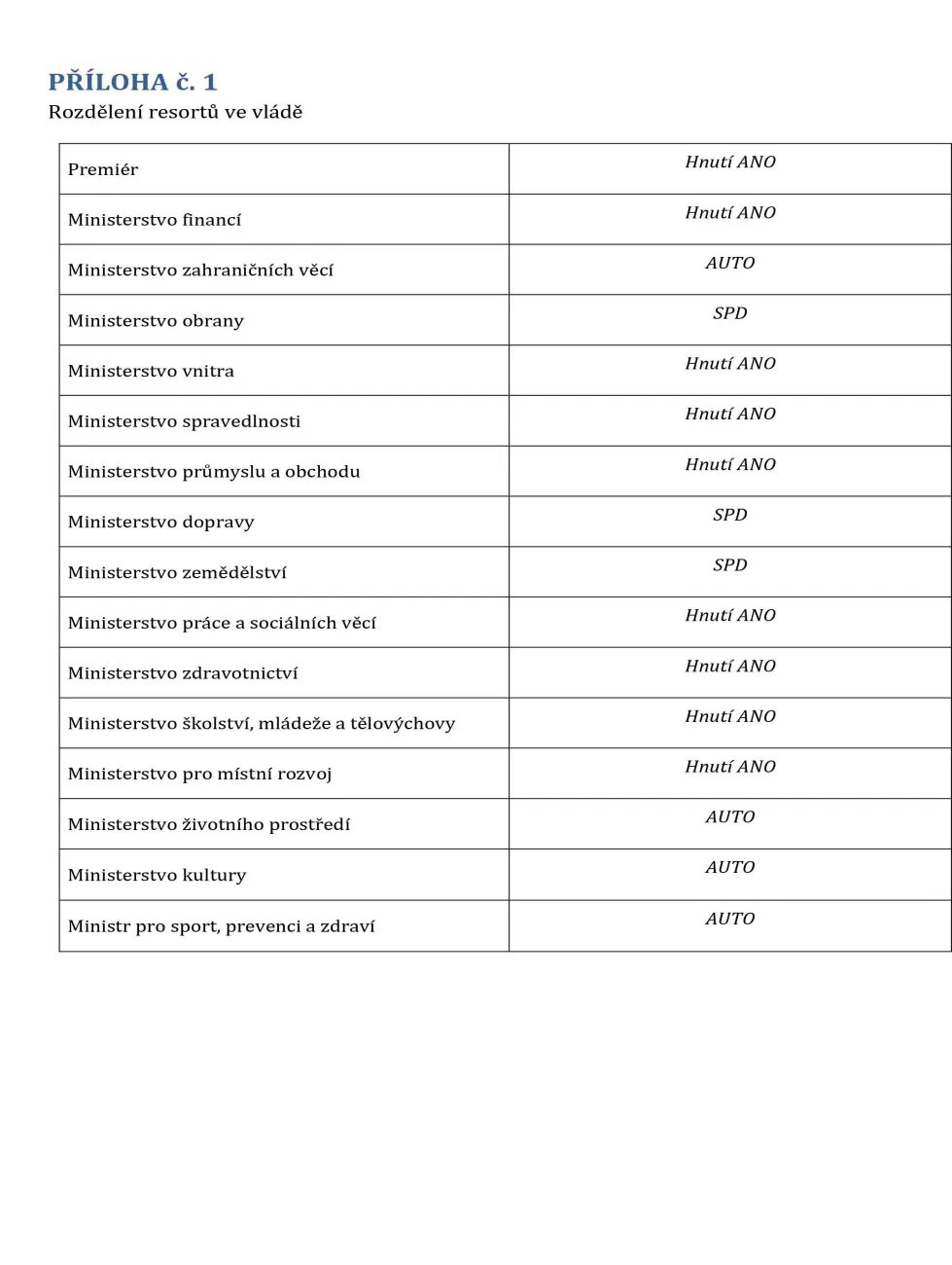„Součástí této koaliční smlouvy je rovněž dohoda o obsazení funkce předsedy Poslanecké sněmovny Parlamentu České republiky, přičemž tato pozice na základě společné dohody koaličních stran náleží SPD.“