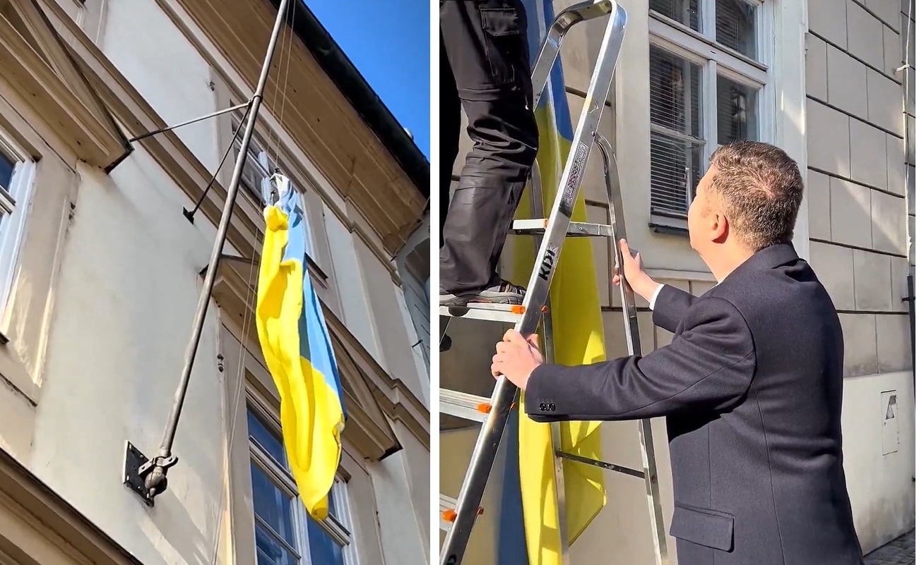 Ruslan Stefančuk, předseda ukrajinského parlamentu: „Ukrajinská vlajka – svatyně našeho národa. Tato vlajka se jako první objevuje na územích osvobozených od ruských okupantů. Tuto vlajku nosí u srdce každý ukrajinský voják. Touto vlajkou přikrýváme rakve našich Hrdinů, když se s nimi loučíme – těch, kteří položili život za budoucnost svobodného světa. Dnes je Ona prostřelena kulkami, spálena ohněm boje, ale vlaje jako symbol svobody – a proto si zaslouží zvláštní úctu a respekt. Strhnout ukrajinskou vlajku z budovy parlamentu evropské země, jejíž bratrský národ podporuje Ukrajince v tomto spravedlivém boji, je pochybný čin… I kdybys jen držel žebřík.“